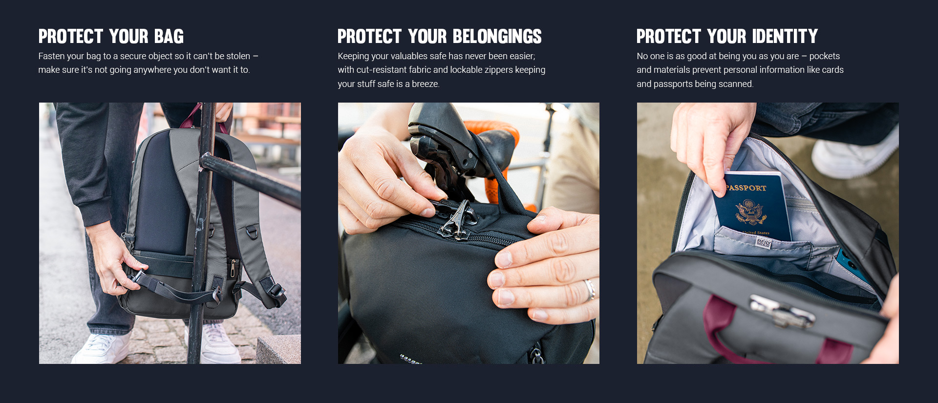 Take on the urban jungle with a slimline anti-theft backpack equipped for city adventures. Organization pockets sort your gear, including a hidden stash for your valuables against your back, while everything is further secured by lockable zips and other anti-theft technology.