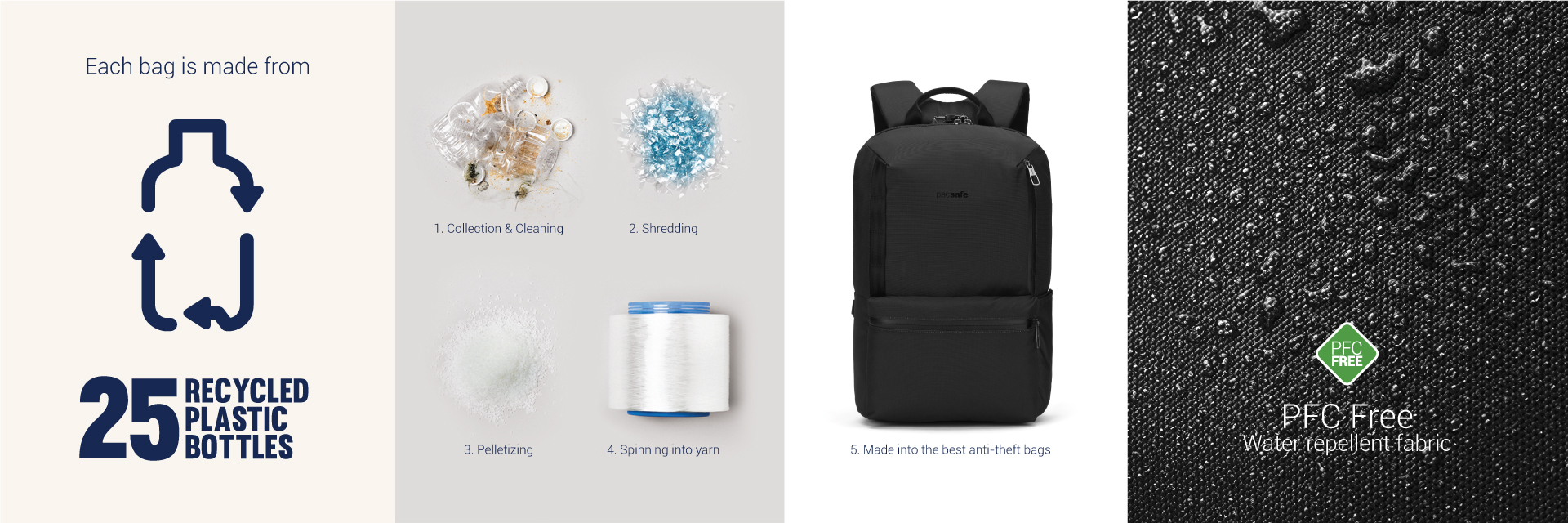 This product is made with post-consumer recycled polyester (rPET), equivalent to 25 recycled plastic bottles, and is treated with a 100% PFC-free water repellency.