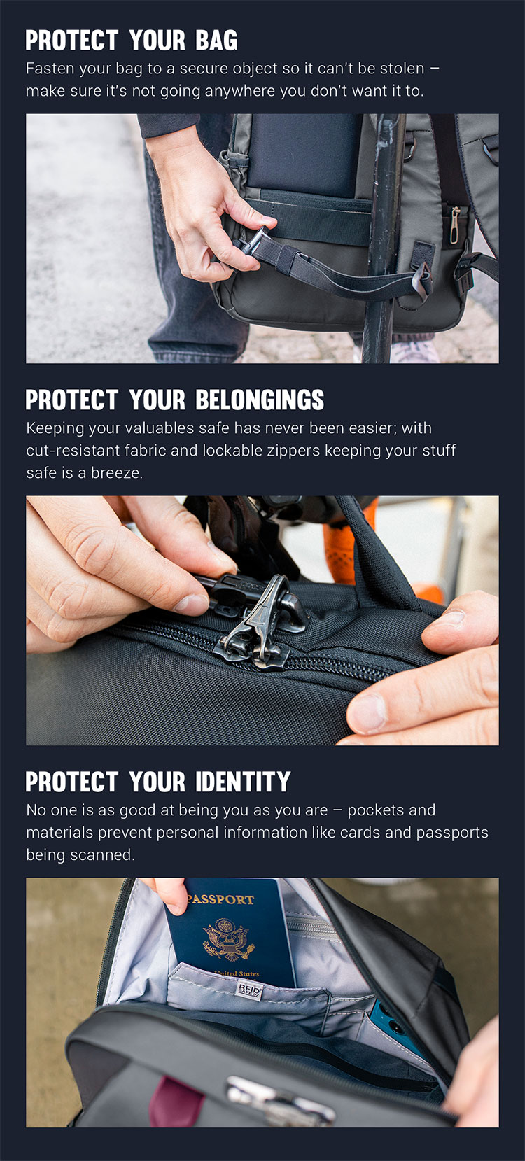 • Carrysafe® slashguard strap with Dyneema®