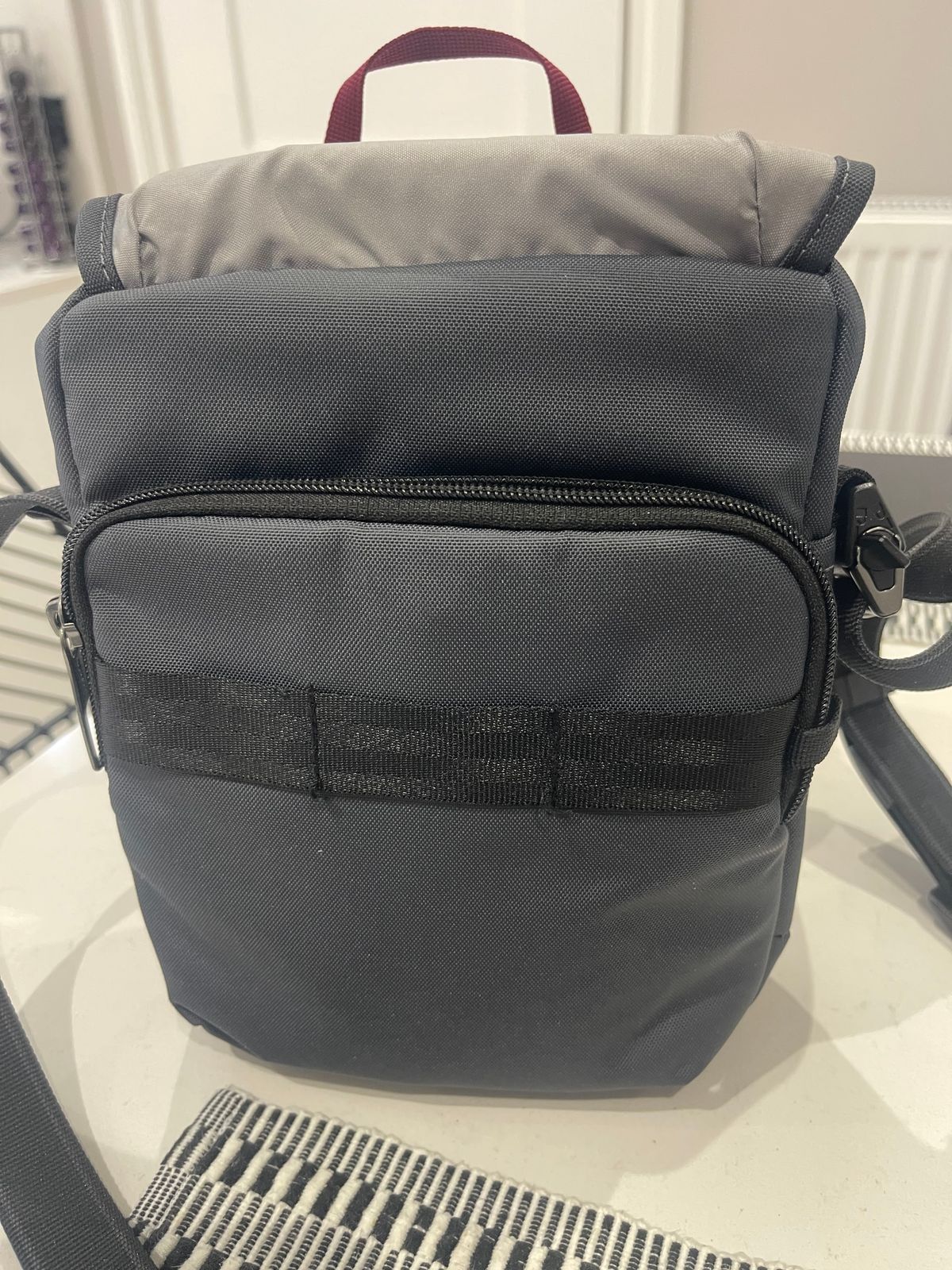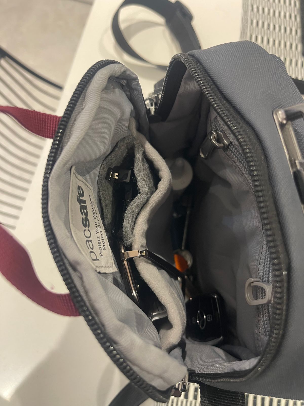 Bag used everyday to carry my iPhone 12 Pro Max which only just fits the front zipped pocket could have done with that compartment a little taller as there is space to make it taller but it fits and zips closed. I would do away with the loop tape on the front. Personally I see a purpose for it. Main compartment has 2 open pockets one holds 2 pair of glasses the main part of the bag holds a ventolin, eye drops, keys and air pods, there is also a zip pocket that holds my wallet and there’s space for a fee more items if needed. I would like to see the main compartment open up a little wider to make access a little easier. The bag is excellent quality which you would expect for the price. The locking system on the zip is well designed and only used when I travel. For now I am really pleased with this bag. I stopped buying all the other non leather bags out there out there as they couldn’t take daily use and wouldn’t last only a few months. It’s a quality bag perfect for travel and for me, everyday use.